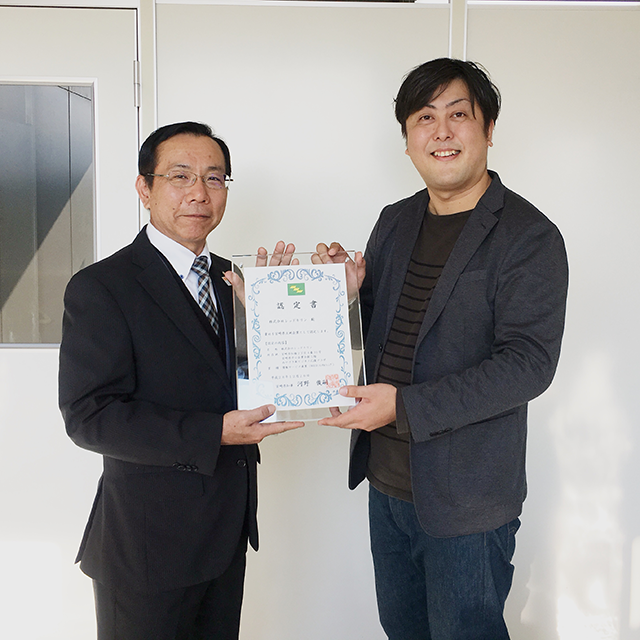 写真は2016年12月20日 宮崎県企業立地認定の際に、宮崎県商工観光労働部 企業立地推進局 黒木局長(写真右)とともに
